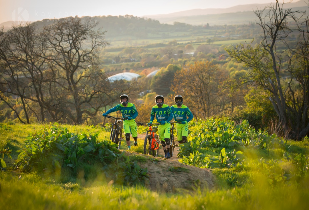 Three mountain bikers walking up a hill in Cheltenham Kay Ransom Photography
